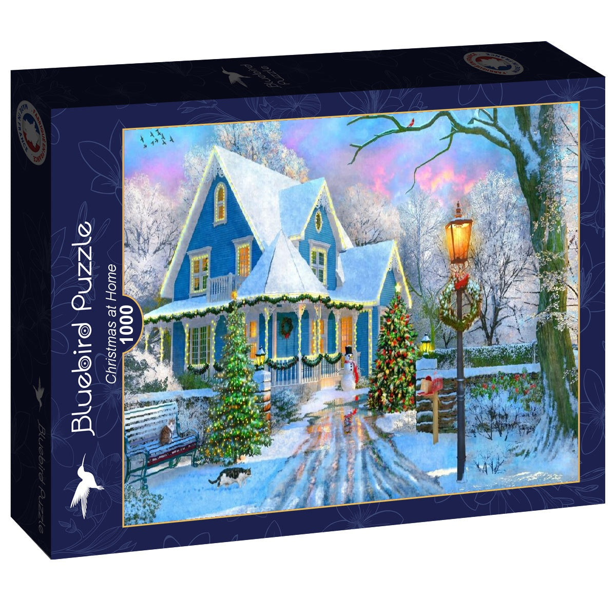 Step into a heartwarming winter scene with the Christmas at Home puzzle. This 1000-piece puzzle captures the charm of a snowy Christmas evening, centred around a beautifully decorated blue house glowing warmly with festive lights. The snow-covered roof, the twinkling Christmas tree in the front yard, and a friendly snowman create a nostalgic holiday atmosphere. The golden light from the lamppost and the pink hues of a setting winter sun add a touch of magic to the scene, while a frosty pathway lined with evergreen garlands invites you to join the festive cheer.