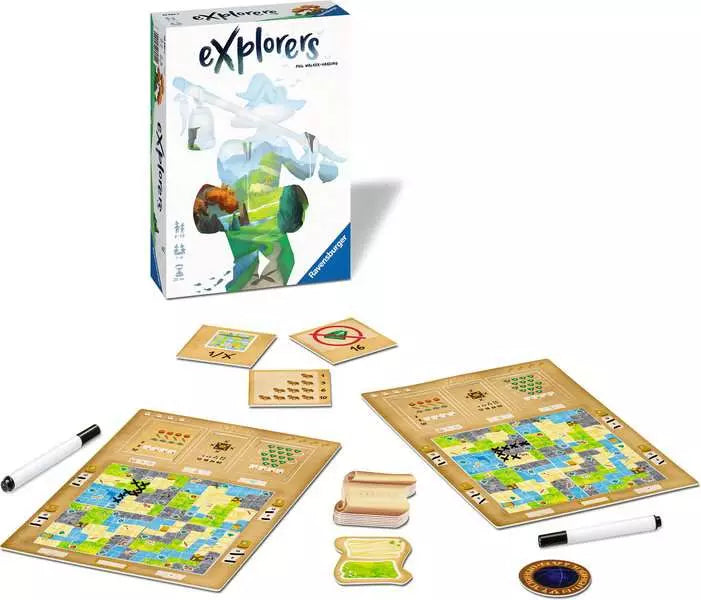 Discover the world of Explorers! In this exciting board game, you and your fellow adventurers start by placing four landscape tiles - grasslands, bodies of water, desert, or mountains - and three different scoring tiles in your game frame. Then, you embark on a journey of exploration! Each exploration card reveals two landscapes, and you must choose one of them to cross off three spaces ahead of your current location. Your fellow players must then decide whether to place two crosses on the same terrain or select the other landscape and cross off three more spaces. All your crosses must be orthogonally adjacent, so plan carefully to avoid being stuck! Over four rounds, your territory expands and you gain special actions for each box with an object. You can also gain points for provisions and gems, with a map allowing you to cross off any terrain. Lost temples can be explored with keys - whoever reaches the temple first gets the most points! Explorers includes a solo version and extra task tiles for experienced players, with over a million possible game combinations.