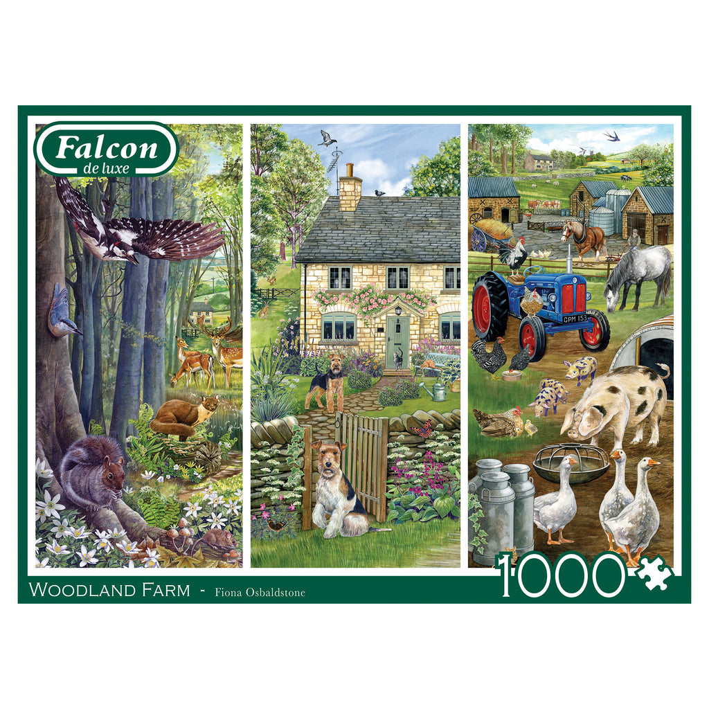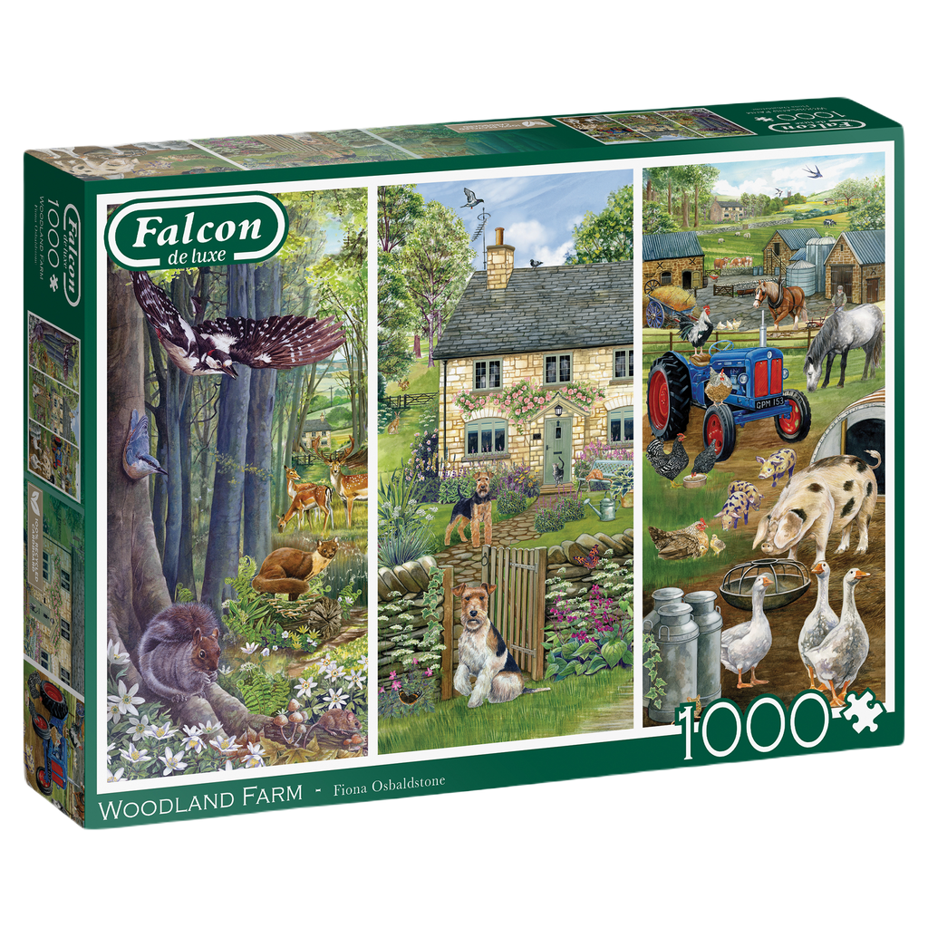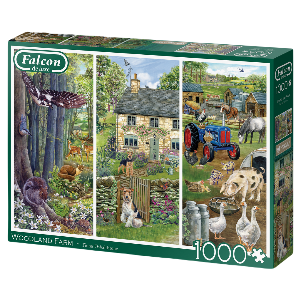 Immerse yourself in the tranquil beauty of the countryside with our 'Woodland Farm' 1000-piece jigsaw. Illustrated by Fiona Osbaldstone, this puzzle captures the essence of rural life through a triptych of enchanting scenes. The left panel invites you into a serene woodland, where wildlife from majestic stags to curious squirrels coexist peacefully amongst the lush foliage.