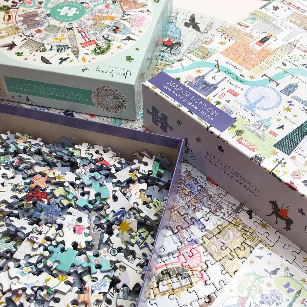 Map of London is the gorgeous 1000 piece puzzle by talented artist, Josie Shenoy. The intricate illustration was created by artist Josie Shenoy and was originally created as the book cover for her non-fiction picture book, ‘The Buildings That Made London’ which was written by historian David Long.