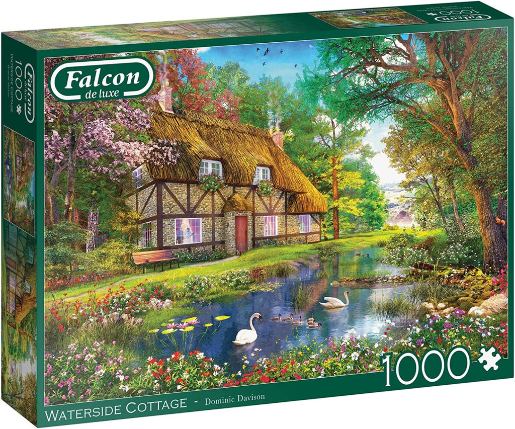 Waterside Cottage is the title of this beautifully illustrated 1000-piece Falcon de luxe jigsaw puzzle, which is part of the Falcon Cottages puzzle theme. The colourful image depicts an idyllic waterside cottage surrounded by lush trees and flowers in full bloom, and the family of swans and cygnets that call the calm waters their home. This nostalgic 1000-piece jigsaw puzzle has been illustrated by the very talented artist ? Dominic Davison. The finished size of the 1000-piece jigsaw puzzle measures 68 x 49cm (approximately) and has been produced using high-quality recycled board to ensure every jigsaw piece maintains its original shape and creates a poster-like finish.