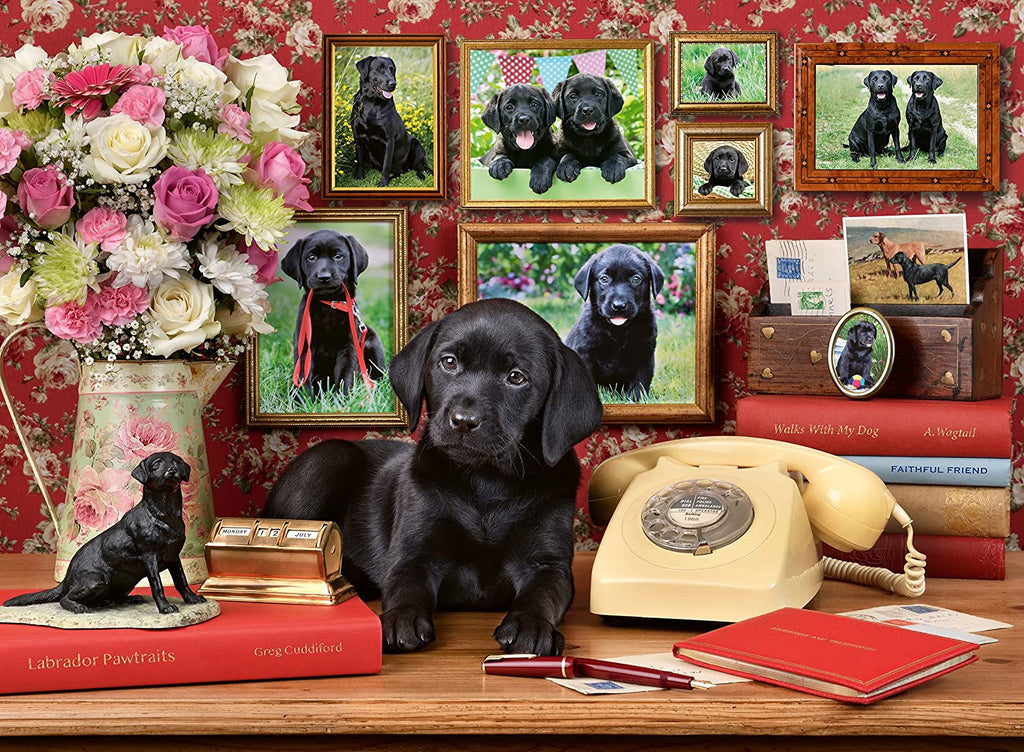 A cute black lab pup patiently waits for his owner to return. It looks like his owner isn't far away, because they've left their fountain pen open on the desk; perhaps they've just gone to answer the door? A perfect dog gift [but not for dogs obviously]