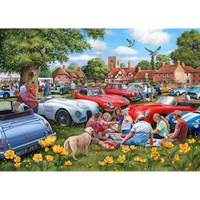 Step into a vibrant world of classic cars and summer fun with the 'Rally Round' 1000-piece jigsaw puzzle. This delightful scene encapsulates the spirit of a joyful car rally gathering, where families and friends come together to admire breathtaking automobiles under an immaculate blue sky. The puzzle showcases an array of stunning vintage cars, from sleek sports models to charming classics, each radiating a sense of nostalgia and adventure.