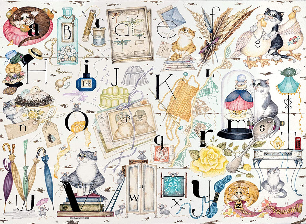 A is for Apple, B is for Buttons, C is for Cotton ? this charming alphabet will entertain you as you discover all of these exquisite vintage-themed objects. The complete list of items is Apple, Buttons/Beads, Cotton, Dragonfly, Envelope, Feathers, Goose, Hat, Ink, Jelly, Knitting, Lace, Mouse, Nest, Orange, Postcards, Queen, Rose, Spoon, Teapot/Table/Telephone Box, Umbrellas, Volumes, Wardrobe, X-Ray, Yarn, Zip. A note from the Artist, Linda Jane Smith. The Alphabet is a new venture for me, but it still incorporates all the vintage 'old stuff' that I love to collect and ,of course, cats and mice too! Crochet bunting, a broken pearl necklace and silken threads are scattered amongst bundles of faded postcards, elderly ladies hats, and even my mom?s old silver spoon. Our 500pc piece jigsaws are crafted with premium quality and measure 49 x 36cm when complete. Great for Adults and ideal puzzles for Children 10 years old and up.