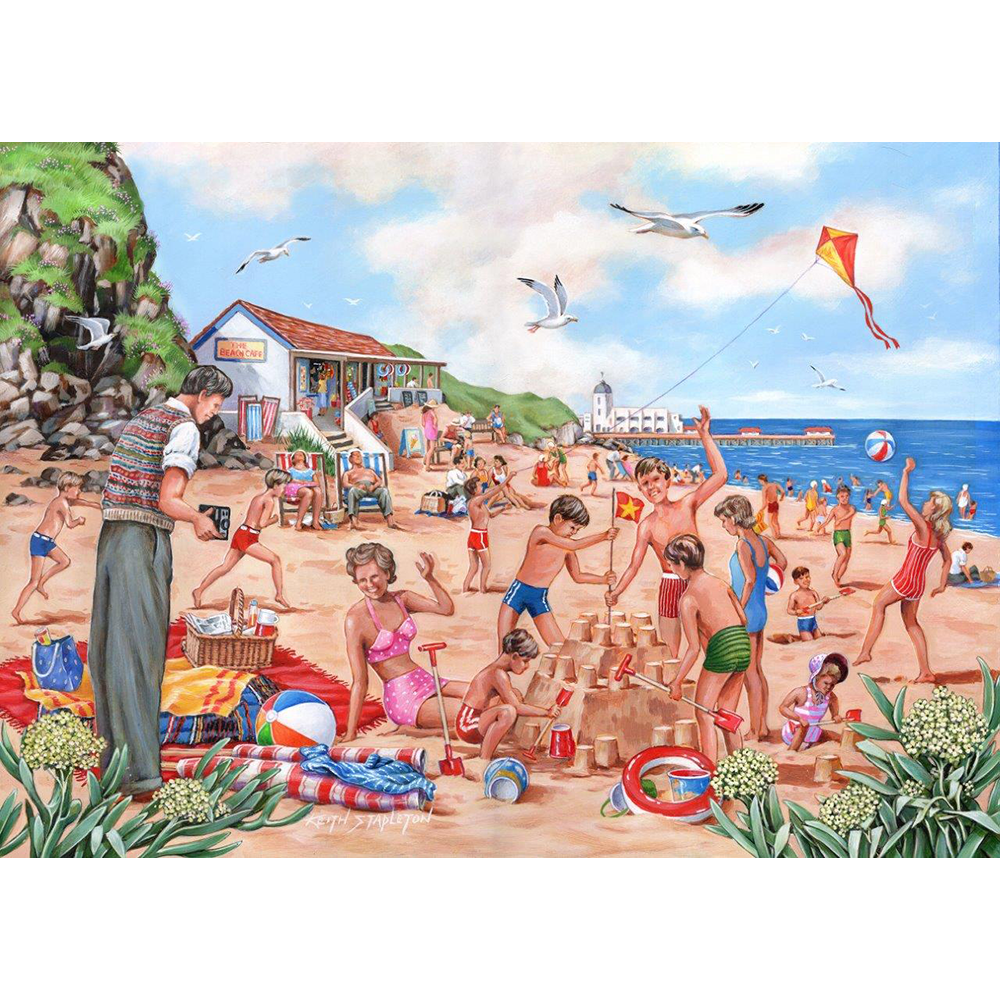 Capture the essence of a joyful summer day with the 'Say Cheese - BIG' 500-piece jigsaw puzzle. This vibrant and lively beach scene invites puzzlers of all ages to piece together delightful moments of seaside fun, making it an entertaining addition to your collection.