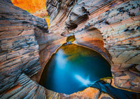 Richly textured layered rock faces with similar brown and orange tones across large areas, combined with the deep blue water pool, create a challenging but visually rewarding puzzle.